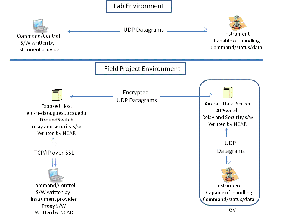 Instrument PIs will be expected to write control and status messages to UDP datagrams and likewise their instruments and control software will read datagrams provided by their counterpart and act upon them. The following diagram shows how the (PI written) control software will interact with the (PI written) software in both the laboratory environment as well as in the field project environment.